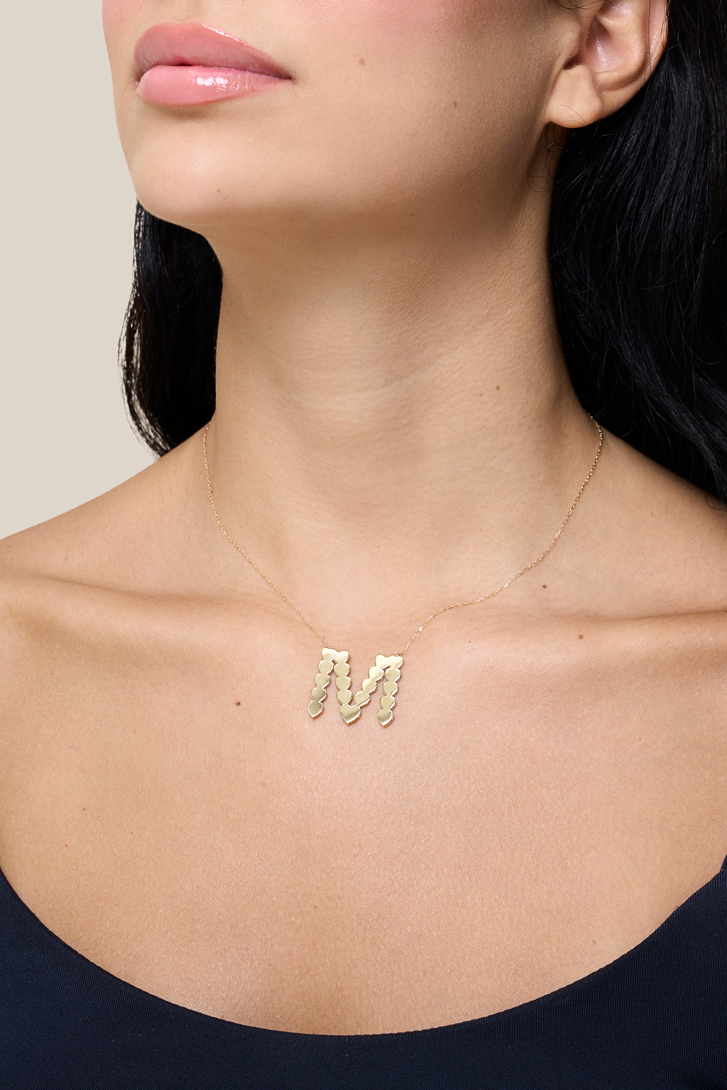 Gold necklace with a 'M' pendant on a beige background
