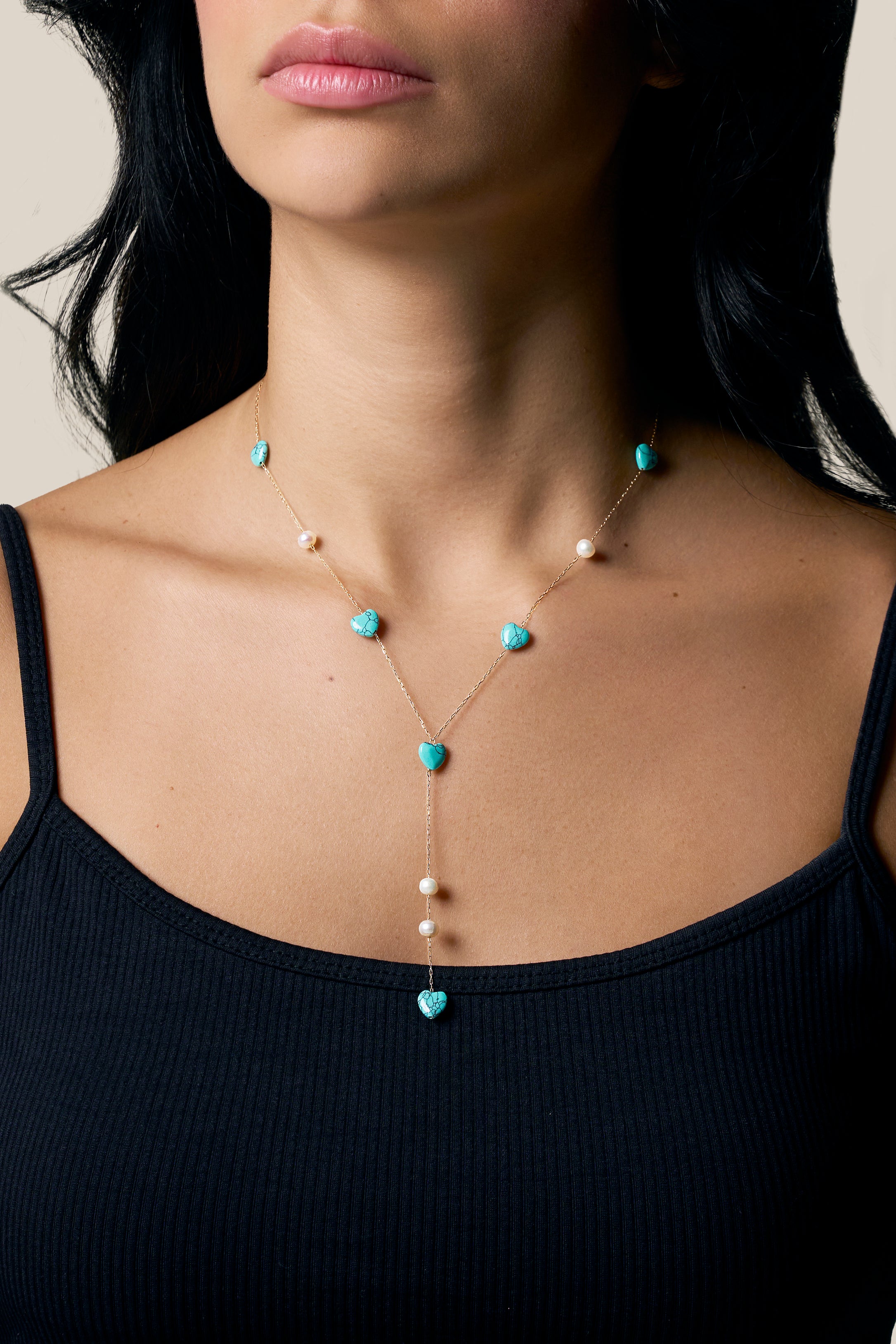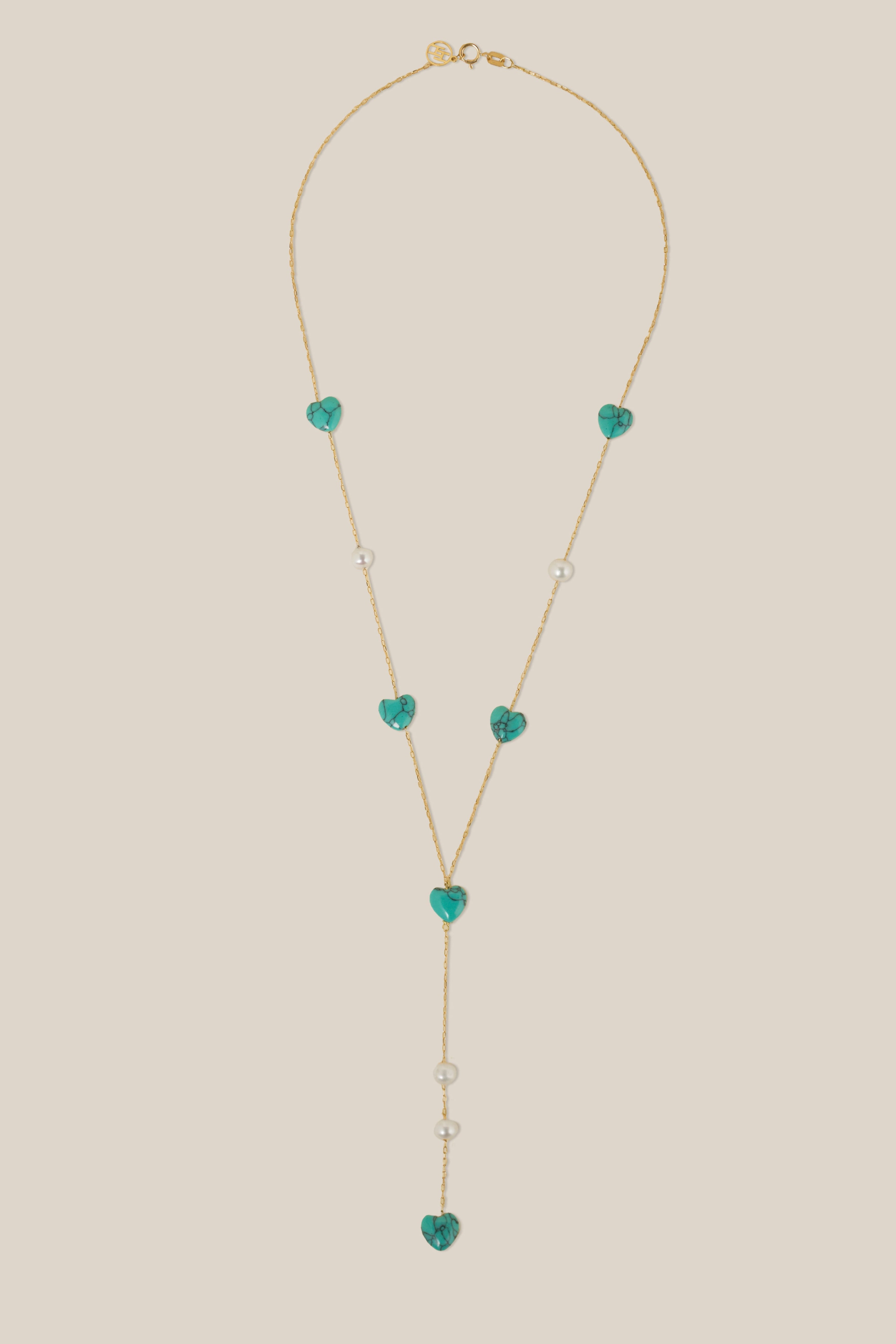 Aqua Hearts and Pearl Long Necklace - Yellow Gold