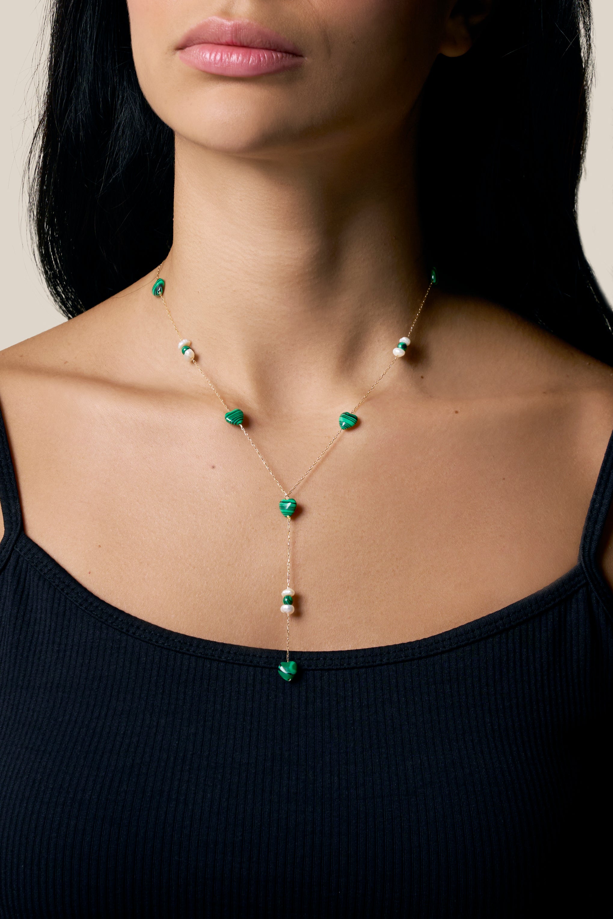 Green Hearts and Pearl and Green Beads Long Necklace - Yellow Gold