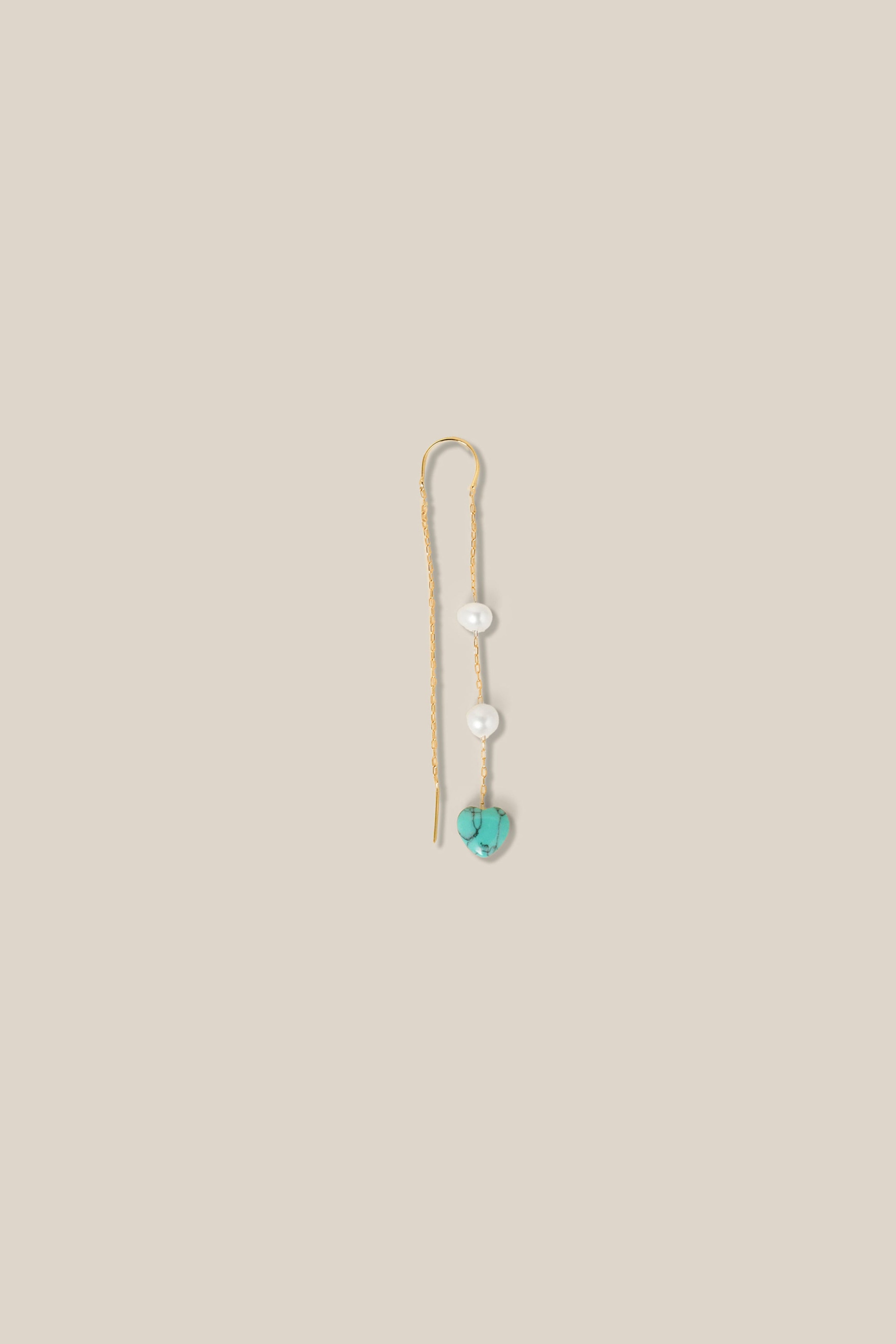 One Aqua Heart and Two Pearls Earring - Yellow Gold
