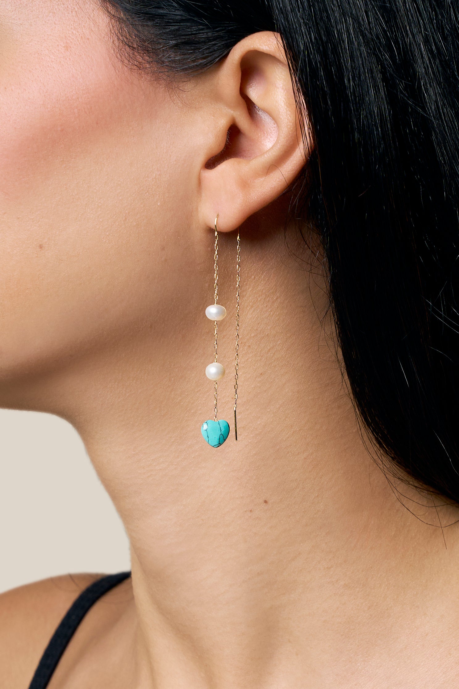 One Aqua Heart and Two Pearls Earring - Yellow Gold